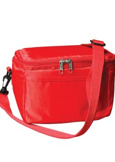 Polyester with PVC backing 420D. Insulated cooler. Adjustable/ detachable shoulder strap. Double zippered one main compartment. Front edge to edge pocket. Embroidery accessible.