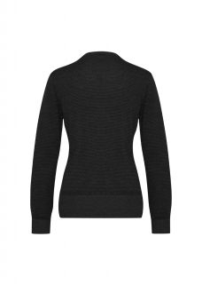 Fully fashioned needle out knit. Contemporary styling. Low pill.